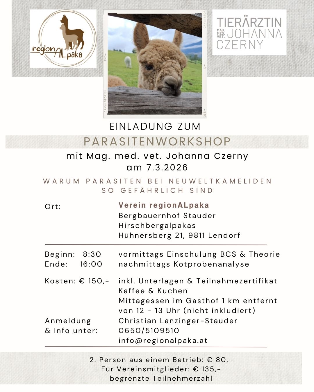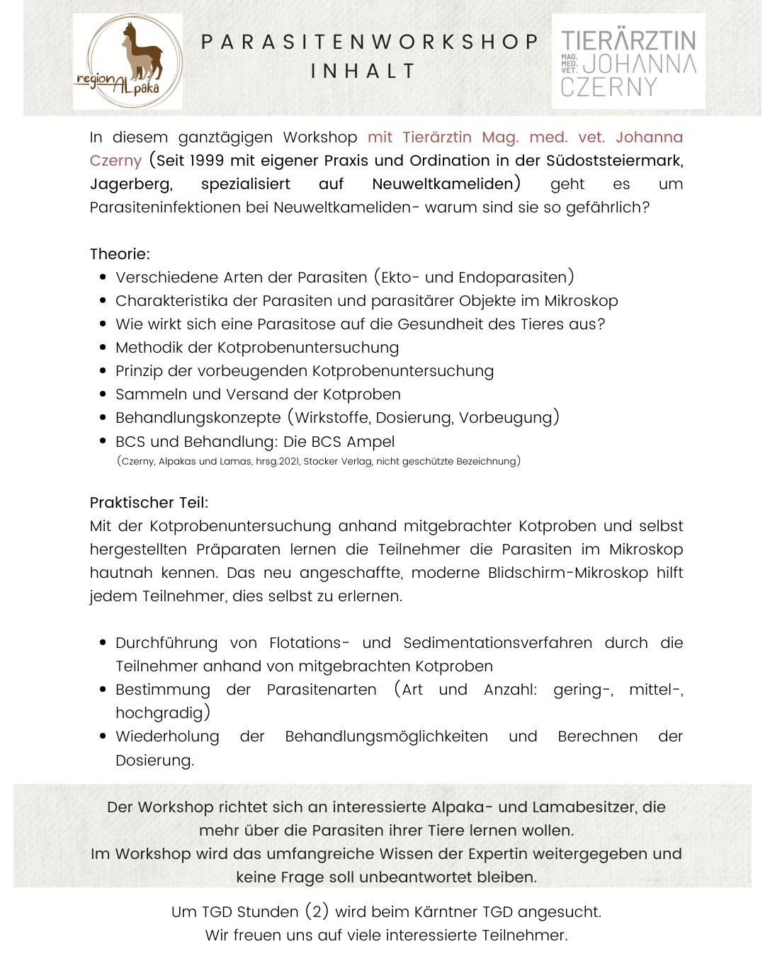 Herzliche Einladung zu einem interessanten, lehrreichen Workshop bei uns am Hof mit Tierärztin Mag. med. vet. Johanna Czerny aus der Steiermark